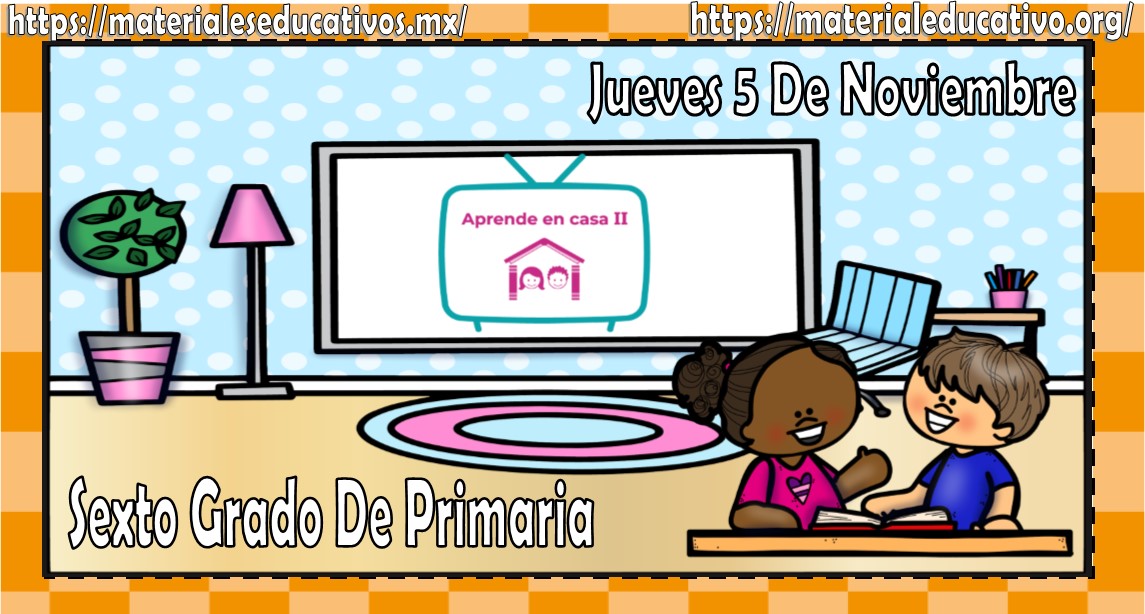 Amigos, compañeros docentes, padres de familia y alumnos que nos visitan, como ya es costumbre nosotros les proporcionaremos las clases contempladas para observarse en la TV del programa aprende en casa II, lo que antes se conocía como videos y preguntas. En esta oportunidad les queremos proporcionar las clases del sexto grado de primaria del jueves 5 de noviembre del 2020 del presente ciclo escolar 2020 – 2021, estaremos seguros que con este material podrá facilitar la realización de las actividades planteadas por parte del programa. Muchas gracias por visitarnos y recuerden que aquí podrán encontrar las preguntas, videos y todas las clases del programa de aprende en casa 2. Recuerden compartir nuestros enlaces en sus redes sociales y etiquetar a sus compañeros y amigos docentes en nuestras publicaciones.