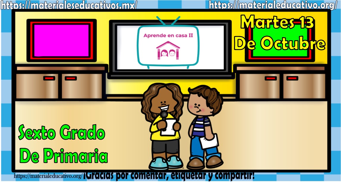 Amigos, compañeros docentes, padres de familia y alumnos que nos visitan, como ya es costumbre nosotros les proporcionaremos las clases contempladas para observarse en la TV del programa aprende en casa II, lo que antes se conocía como videos y preguntas. En esta oportunidad les queremos proporcionar las clases del sexto grado de primaria del martes 13 de octubre del 2020 del presente ciclo escolar 2020 – 2021, estaremos seguros que con este material podrá facilitar la realización de las actividades planteadas por parte del programa. Muchas gracias por visitarnos y recuerden que aquí podrán encontrar las preguntas, videos y todas las clases del programa de aprende en casa 2. Recuerden compartir nuestros enlaces en sus redes sociales y etiquetar a sus compañeros y amigos docentes en nuestras publicaciones.
