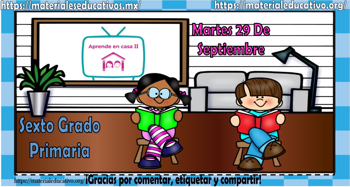 Amigos, compañeros docentes, padres de familia y alumnos que nos visitan, como ya es costumbre nosotros les proporcionaremos las clases contempladas para observarse en la TV del programa aprende en casa II, lo que antes se conocía como videos y preguntas. En esta oportunidad les queremos proporcionar las clases del sexto grado de primaria del martes 29 de septiembre del 2020 del presente ciclo escolar 2020 – 2021, estaremos seguros que con este material podrá facilitar la realización de las actividades planteadas por parte del programa. Muchas gracias por visitarnos y recuerden que aquí podrán encontrar las preguntas, videos y todas las clases del programa de aprende en casa 2. Recuerden compartir nuestros enlaces en sus redes sociales y etiquetar a sus compañeros y amigos docentes en nuestras publicaciones.