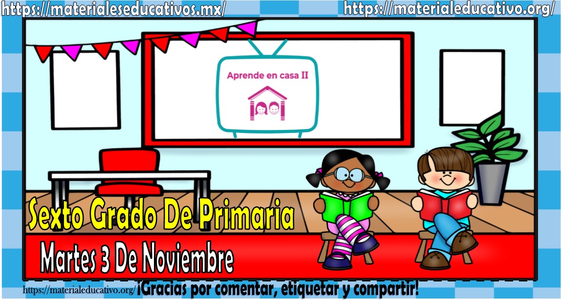 Amigos, compañeros docentes, padres de familia y alumnos que nos visitan, como ya es costumbre nosotros les proporcionaremos las clases contempladas para observarse en la TV del programa aprende en casa II, lo que antes se conocía como videos y preguntas. En esta oportunidad les queremos proporcionar las clases del sexto grado de primaria del martes 3 de noviembre del 2020 del presente ciclo escolar 2020 – 2021, estaremos seguros que con este material podrá facilitar la realización de las actividades planteadas por parte del programa. Muchas gracias por visitarnos y recuerden que aquí podrán encontrar las preguntas, videos y todas las clases del programa de aprende en casa 2. Recuerden compartir nuestros enlaces en sus redes sociales y etiquetar a sus compañeros y amigos docentes en nuestras publicaciones.