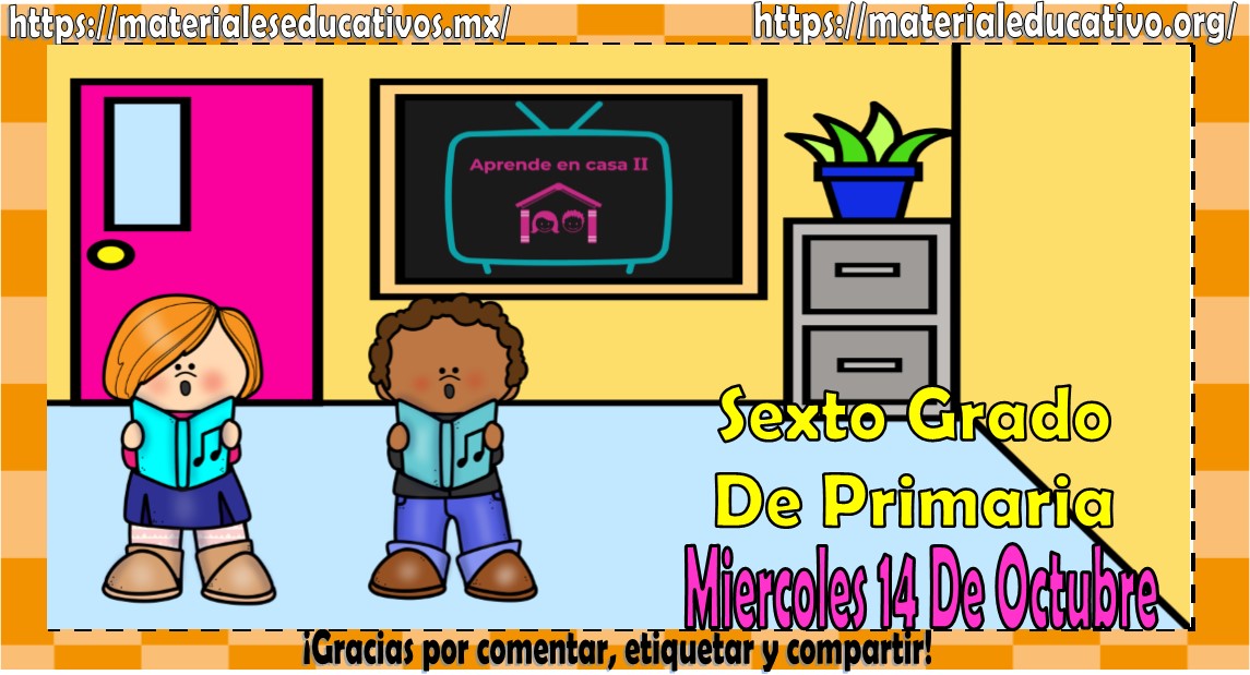 Amigos, compañeros docentes, padres de familia y alumnos que nos visitan, como ya es costumbre nosotros les proporcionaremos las clases contempladas para observarse en la TV del programa aprende en casa II, lo que antes se conocía como videos y preguntas. En esta oportunidad les queremos proporcionar las clases del sexto grado de primaria del miércoles 14 de octubre del 2020 del presente ciclo escolar 2020 – 2021, estaremos seguros que con este material podrá facilitar la realización de las actividades planteadas por parte del programa. Muchas gracias por visitarnos y recuerden que aquí podrán encontrar las preguntas, videos y todas las clases del programa de aprende en casa 2. Recuerden compartir nuestros enlaces en sus redes sociales y etiquetar a sus compañeros y amigos docentes en nuestras publicaciones.
