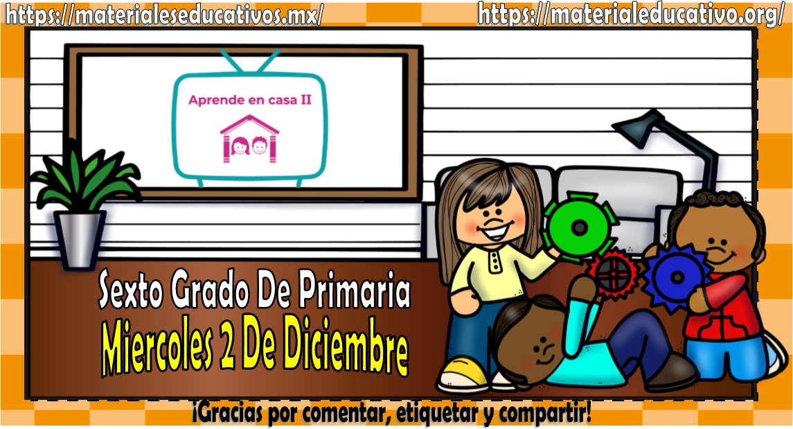 Amigos, compañeros docentes, padres de familia y alumnos que nos visitan, como ya es costumbre nosotros les proporcionaremos las clases contempladas para observarse en la TV del programa aprende en casa II, lo que antes se conocía como videos y preguntas. En esta oportunidad les queremos proporcionar las clases del sexto grado de primaria del miércoles 2 de diciembre del 2020 del presente ciclo escolar 2020 – 2021, estaremos seguros que con este material podrá facilitar la realización de las actividades planteadas por parte del programa. Muchas gracias por visitarnos y recuerden que aquí podrán encontrar las preguntas, videos y todas las clases del programa de aprende en casa 2. Recuerden compartir nuestros enlaces en sus redes sociales y etiquetar a sus compañeros y amigos docentes en nuestras publicaciones.