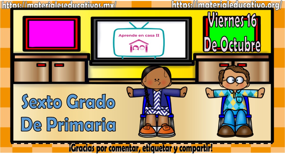 Amigos, compañeros docentes, padres de familia y alumnos que nos visitan, como ya es costumbre nosotros les proporcionaremos las clases contempladas para observarse en la TV del programa aprende en casa II, lo que antes se conocía como videos y preguntas. En esta oportunidad les queremos proporcionar las clases del sexto grado de primaria del viernes 16 de octubre del 2020 del presente ciclo escolar 2020 – 2021, estaremos seguros que con este material podrá facilitar la realización de las actividades planteadas por parte del programa. Muchas gracias por visitarnos y recuerden que aquí podrán encontrar las preguntas, videos y todas las clases del programa de aprende en casa 2. Recuerden compartir nuestros enlaces en sus redes sociales y etiquetar a sus compañeros y amigos docentes en nuestras publicaciones.