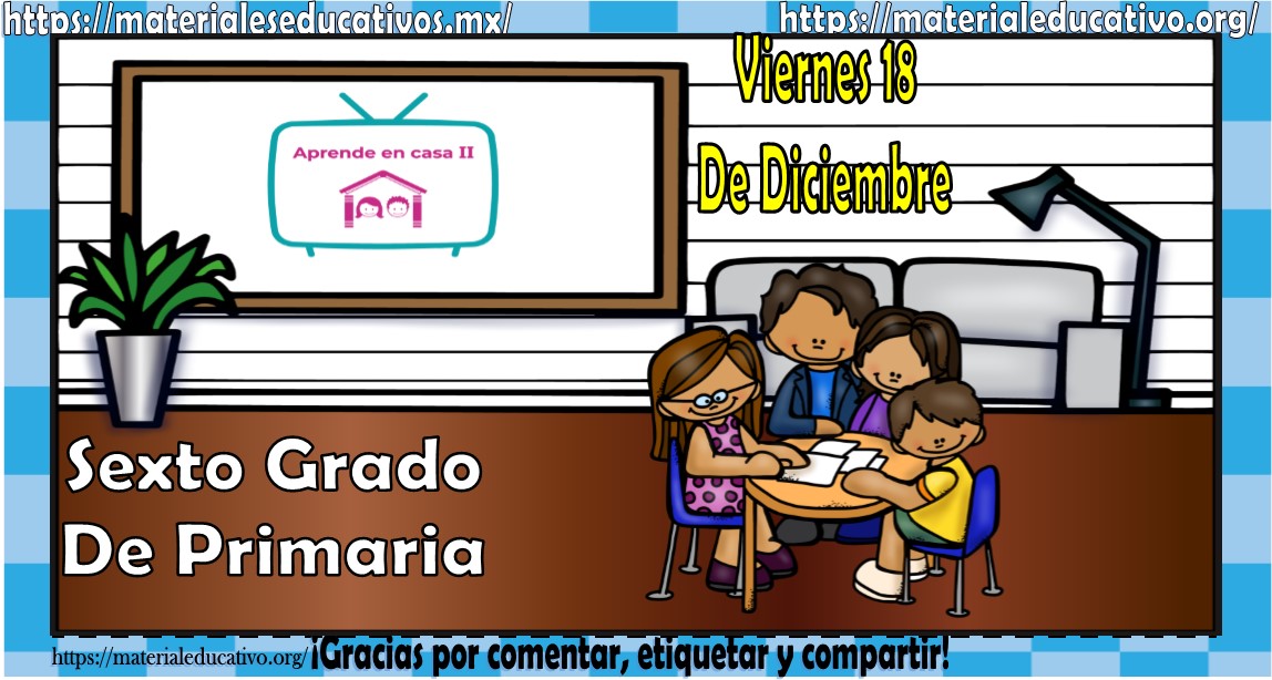 Amigos, compañeros docentes, padres de familia y alumnos que nos visitan, como ya es costumbre nosotros les proporcionaremos las clases contempladas para observarse en la TV del programa aprende en casa II, lo que antes se conocía como videos y preguntas. En esta oportunidad les queremos proporcionar las clases del sexto grado de primaria del viernes 18 de diciembre del 2020 del presente ciclo escolar 2020 – 2021, estaremos seguros que con este material podrá facilitar la realización de las actividades planteadas por parte del programa. Muchas gracias por visitarnos y recuerden que aquí podrán encontrar las preguntas, videos y todas las clases del programa de aprende en casa 2. Recuerden compartir nuestros enlaces en sus redes sociales y etiquetar a sus compañeros y amigos docentes en nuestras publicaciones.