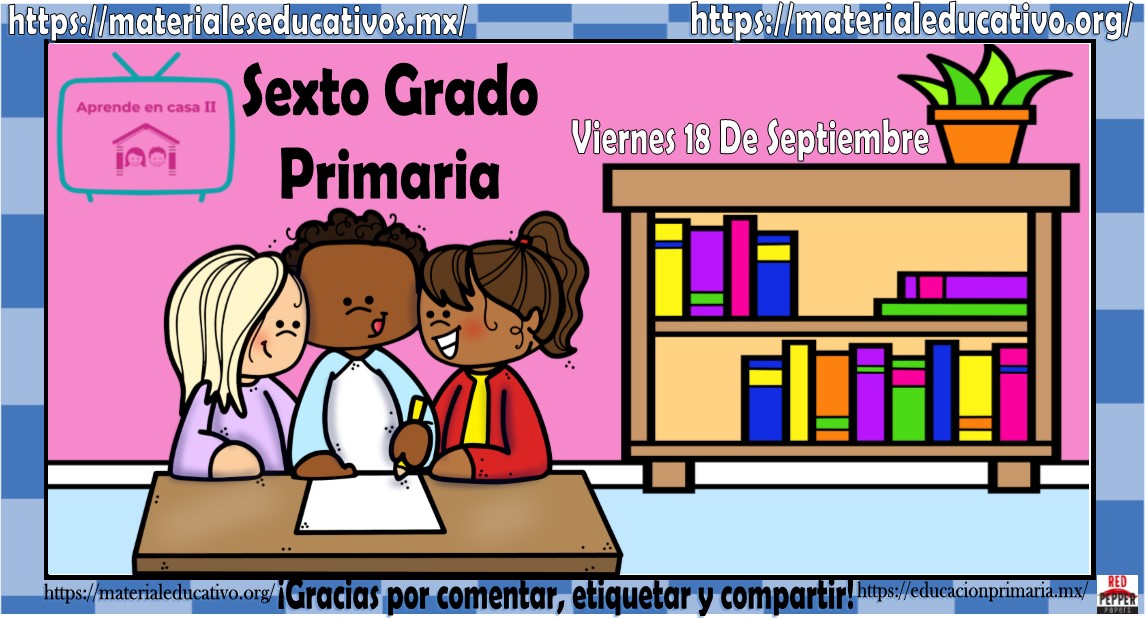 Amigos, compañeros docentes, padres de familia y alumnos que nos visitan, como ya es costumbre nosotros les proporcionaremos las clases contempladas para observarse en la TV del programa aprende en casa II, lo que antes se conocía como videos y preguntas. En esta oportunidad les queremos proporcionar las clases del sexto grado de primaria del viernes 18 de septiembre del 2020 del presente ciclo escolar 2020 – 2021, estaremos seguros que con este material podrá facilitar la realización de las actividades planteadas por parte del programa. Muchas gracias por visitarnos y recuerden que aquí podrán encontrar las preguntas, videos y todas las clases del programa de aprende en casa 2. Recuerden compartir nuestros enlaces en sus redes sociales y etiquetar a sus compañeros y amigos docentes en nuestras publicaciones.
