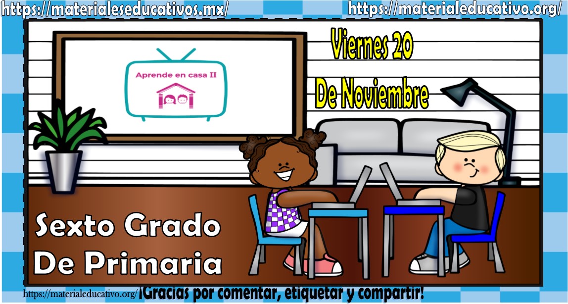 Amigos, compañeros docentes, padres de familia y alumnos que nos visitan, como ya es costumbre nosotros les proporcionaremos las clases contempladas para observarse en la TV del programa aprende en casa II, lo que antes se conocía como videos y preguntas. En esta oportunidad les queremos proporcionar las clases del sexto grado de primaria del viernes 20 de noviembre del 2020 del presente ciclo escolar 2020 – 2021, estaremos seguros que con este material podrá facilitar la realización de las actividades planteadas por parte del programa. Muchas gracias por visitarnos y recuerden que aquí podrán encontrar las preguntas, videos y todas las clases del programa de aprende en casa 2. Recuerden compartir nuestros enlaces en sus redes sociales y etiquetar a sus compañeros y amigos docentes en nuestras publicaciones.