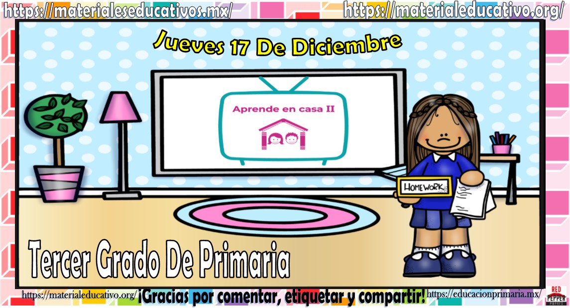 Amigos, compañeros docentes, padres de familia y alumnos que nos visitan, como ya es costumbre nosotros les proporcionaremos las clases contempladas para observarse en la TV del programa aprende en casa II, lo que antes se conocía como videos y preguntas. En esta oportunidad les queremos proporcionar las clases del tercer grado de primaria del jueves 17 de diciembre del 2020 del presente ciclo escolar 2020 – 2021, estaremos seguros que con este material podrá facilitar la realización de las actividades planteadas por parte del programa. Muchas gracias por visitarnos y recuerden que aquí podrán encontrar las preguntas, videos y todas las clases del programa de aprende en casa 2. Recuerden compartir nuestros enlaces en sus redes sociales y etiquetar a sus compañeros y amigos docentes en nuestras publicaciones.