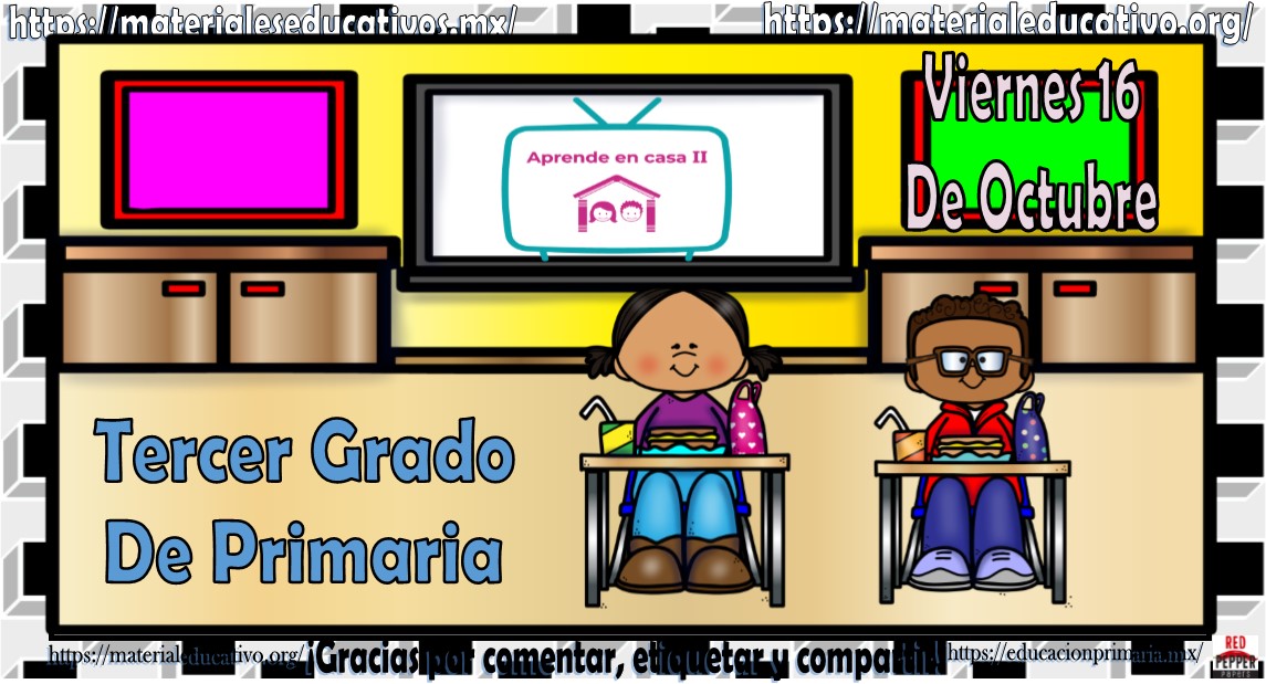 Amigos, compañeros docentes, padres de familia y alumnos que nos visitan, como ya es costumbre nosotros les proporcionaremos las clases contempladas para observarse en la TV del programa aprende en casa II, lo que antes se conocía como videos y preguntas. En esta oportunidad les queremos proporcionar las clases del tercer grado de primaria del viernes 16 de octubre del 2020 del presente ciclo escolar 2020 – 2021, estaremos seguros que con este material podrá facilitar la realización de las actividades planteadas por parte del programa. Muchas gracias por visitarnos y recuerden que aquí podrán encontrar las preguntas, videos y todas las clases del programa de aprende en casa 2. Recuerden compartir nuestros enlaces en sus redes sociales y etiquetar a sus compañeros y amigos docentes en nuestras publicaciones.