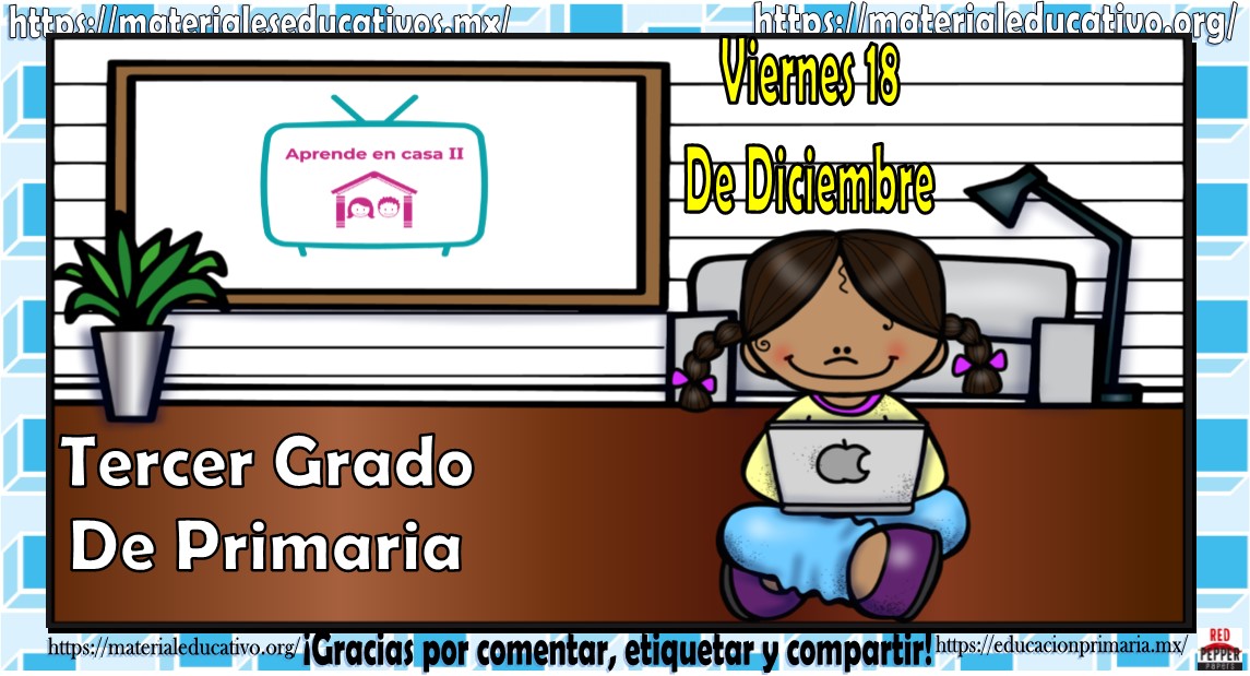 Amigos, compañeros docentes, padres de familia y alumnos que nos visitan, como ya es costumbre nosotros les proporcionaremos las clases contempladas para observarse en la TV del programa aprende en casa II, lo que antes se conocía como videos y preguntas. En esta oportunidad les queremos proporcionar las clases del tercer grado de primaria del viernes 18 de diciembre del 2020 del presente ciclo escolar 2020 – 2021, estaremos seguros que con este material podrá facilitar la realización de las actividades planteadas por parte del programa. Muchas gracias por visitarnos y recuerden que aquí podrán encontrar las preguntas, videos y todas las clases del programa de aprende en casa 2. Recuerden compartir nuestros enlaces en sus redes sociales y etiquetar a sus compañeros y amigos docentes en nuestras publicaciones.