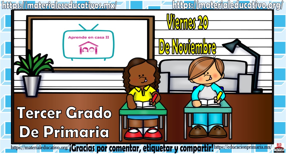 Amigos, compañeros docentes, padres de familia y alumnos que nos visitan, como ya es costumbre nosotros les proporcionaremos las clases contempladas para observarse en la TV del programa aprende en casa II, lo que antes se conocía como videos y preguntas. En esta oportunidad les queremos proporcionar las clases del tercer grado de primaria del viernes 20 de noviembre del 2020 del presente ciclo escolar 2020 – 2021, estaremos seguros que con este material podrá facilitar la realización de las actividades planteadas por parte del programa. Muchas gracias por visitarnos y recuerden que aquí podrán encontrar las preguntas, videos y todas las clases del programa de aprende en casa 2. Recuerden compartir nuestros enlaces en sus redes sociales y etiquetar a sus compañeros y amigos docentes en nuestras publicaciones.