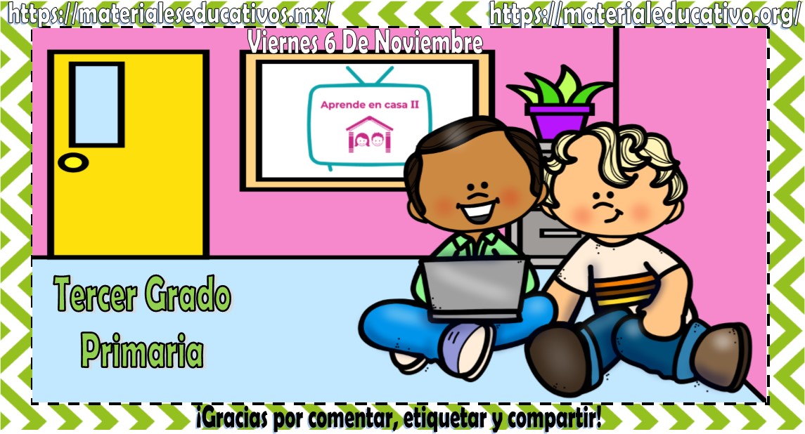 Amigos, compañeros docentes, padres de familia y alumnos que nos visitan, como ya es costumbre nosotros les proporcionaremos las clases contempladas para observarse en la TV del programa aprende en casa II, lo que antes se conocía como videos y preguntas. En esta oportunidad les queremos proporcionar las clases del tercer grado de primaria del viernes 6 de noviembre del 2020 del presente ciclo escolar 2020 – 2021, estaremos seguros que con este material podrá facilitar la realización de las actividades planteadas por parte del programa. Muchas gracias por visitarnos y recuerden que aquí podrán encontrar las preguntas, videos y todas las clases del programa de aprende en casa 2. Recuerden compartir nuestros enlaces en sus redes sociales y etiquetar a sus compañeros y amigos docentes en nuestras publicaciones.