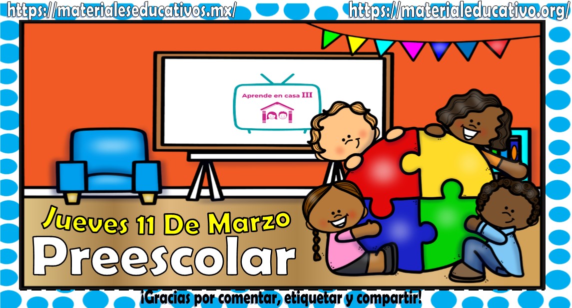 Amigos, compañeros docentes, padres de familia y alumnos que nos visitan, como ya es costumbre nosotros les proporcionaremos las clases contempladas para observarse en la TV del programa aprende en casa II, lo que antes se conocía como videos y preguntas. En esta oportunidad les queremos proporcionar las Mis clases de aprende en casa III de preescolar del jueves 11 de marzo del 2021, estaremos seguros que con este material podrá facilitar la realización de las actividades planteadas por parte del programa. Muchas gracias por visitarnos y recuerden que aquí podrán encontrar las preguntas, videos y todas las clases del programa de aprende en casa 2. Recuerden compartir nuestros enlaces en sus redes sociales y etiquetar a sus compañeros y amigos docentes en nuestras publicaciones.