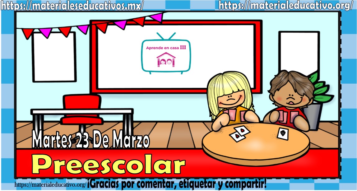 Amigos, compañeros docentes, padres de familia y alumnos que nos visitan, como ya es costumbre nosotros les proporcionaremos las clases contempladas para observarse en la TV del programa aprende en casa II, lo que antes se conocía como videos y preguntas. En esta oportunidad les queremos proporcionar las Mis clases de aprende en casa III de preescolar del martes 23 de marzo del 2021, estaremos seguros que con este material podrá facilitar la realización de las actividades planteadas por parte del programa. Muchas gracias por visitarnos y recuerden que aquí podrán encontrar las preguntas, videos y todas las clases del programa de aprende en casa 2. Recuerden compartir nuestros enlaces en sus redes sociales y etiquetar a sus compañeros y amigos docentes en nuestras publicaciones.