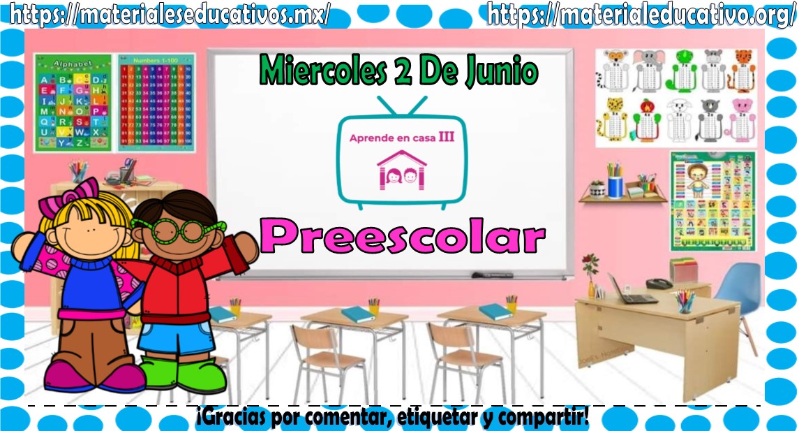 Amigos, compañeros docentes, padres de familia y alumnos que nos visitan, como ya es costumbre nosotros les proporcionaremos las clases contempladas para observarse en la TV del programa aprende en casa II, lo que antes se conocía como videos y preguntas. En esta oportunidad les queremos proporcionar las Mis clases de aprende en casa III de preescolar del miércoles 2 de junio del 2021, estaremos seguros que con este material podrá facilitar la realización de las actividades planteadas por parte del programa. Muchas gracias por visitarnos y recuerden que aquí podrán encontrar las preguntas, videos y todas las clases del programa de aprende en casa 2. Recuerden compartir nuestros enlaces en sus redes sociales y etiquetar a sus compañeros y amigos docentes en nuestras publicaciones.