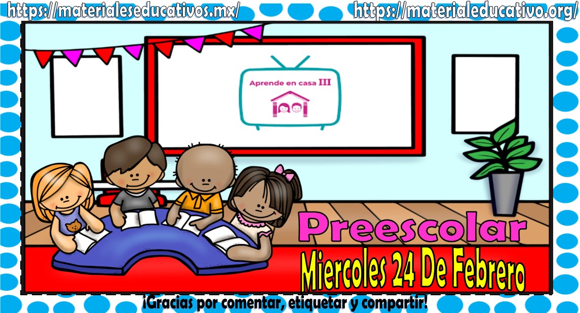 Amigos, compañeros docentes, padres de familia y alumnos que nos visitan, como ya es costumbre nosotros les proporcionaremos las clases contempladas para observarse en la TV del programa aprende en casa II, lo que antes se conocía como videos y preguntas. En esta oportunidad les queremos proporcionar las Mis clases de aprende en casa III de preescolar del miércoles 24 de febrero del 2021, estaremos seguros que con este material podrá facilitar la realización de las actividades planteadas por parte del programa. Muchas gracias por visitarnos y recuerden que aquí podrán encontrar las preguntas, videos y todas las clases del programa de aprende en casa 2. Recuerden compartir nuestros enlaces en sus redes sociales y etiquetar a sus compañeros y amigos docentes en nuestras publicaciones.