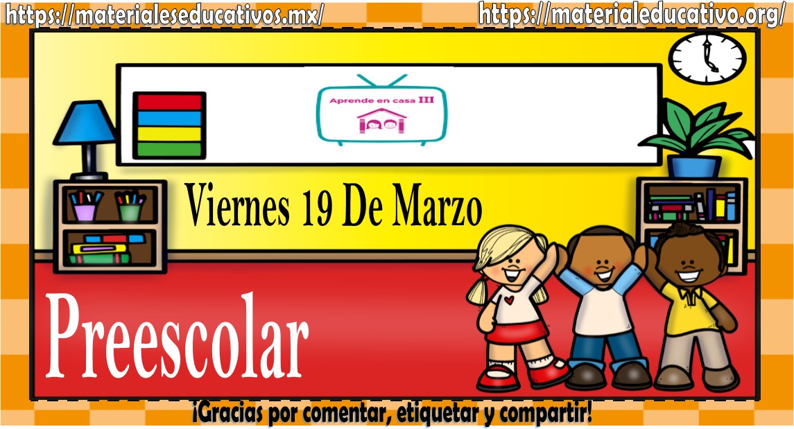 Amigos, compañeros docentes, padres de familia y alumnos que nos visitan, como ya es costumbre nosotros les proporcionaremos las clases contempladas para observarse en la TV del programa aprende en casa II, lo que antes se conocía como videos y preguntas. En esta oportunidad les queremos proporcionar las Mis clases de aprende en casa III de preescolar del viernes 19 de marzo del 2021, estaremos seguros que con este material podrá facilitar la realización de las actividades planteadas por parte del programa. Muchas gracias por visitarnos y recuerden que aquí podrán encontrar las preguntas, videos y todas las clases del programa de aprende en casa 2. Recuerden compartir nuestros enlaces en sus redes sociales y etiquetar a sus compañeros y amigos docentes en nuestras publicaciones.