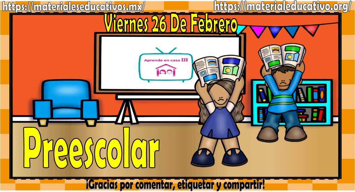 Amigos, compañeros docentes, padres de familia y alumnos que nos visitan, como ya es costumbre nosotros les proporcionaremos las clases contempladas para observarse en la TV del programa aprende en casa II, lo que antes se conocía como videos y preguntas. En esta oportunidad les queremos proporcionar las Mis clases de aprende en casa III de preescolar del viernes 26 de febrero del 2021, estaremos seguros que con este material podrá facilitar la realización de las actividades planteadas por parte del programa. Muchas gracias por visitarnos y recuerden que aquí podrán encontrar las preguntas, videos y todas las clases del programa de aprende en casa 2. Recuerden compartir nuestros enlaces en sus redes sociales y etiquetar a sus compañeros y amigos docentes en nuestras publicaciones.
