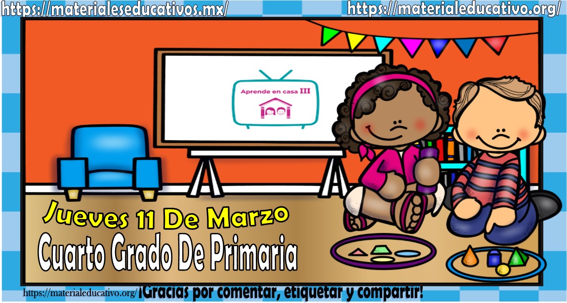 Amigos, compañeros docentes, padres de familia y alumnos que nos visitan, como ya es costumbre nosotros les proporcionaremos las clases contempladas para observarse en la TV del programa aprende en casa III, lo que antes se conocía como videos y preguntas. En esta oportunidad les queremos proporcionar las clases del cuarto grado de primaria del jueves 11 de marzo del 2021 del presente ciclo escolar 2020 – 2021, estaremos seguros que con este material podrá facilitar la realización de las actividades planteadas por parte del programa. Muchas gracias por visitarnos y recuerden que aquí podrán encontrar las preguntas, videos y todas las clases del programa de aprende en casa 2. Recuerden compartir nuestros enlaces en sus redes sociales y etiquetar a sus compañeros y amigos docentes en nuestras publicaciones.