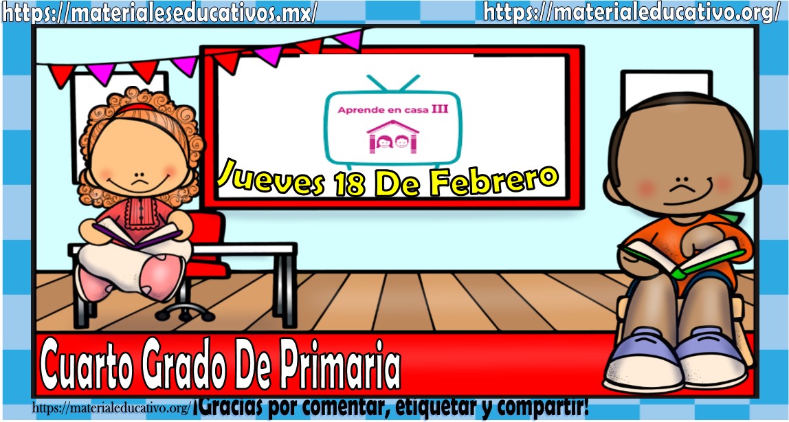 Amigos, compañeros docentes, padres de familia y alumnos que nos visitan, como ya es costumbre nosotros les proporcionaremos las clases contempladas para observarse en la TV del programa aprende en casa III, lo que antes se conocía como videos y preguntas. En esta oportunidad les queremos proporcionar las clases del cuarto grado de primaria del jueves 18 de febrero del 2021 del presente ciclo escolar 2020 – 2021, estaremos seguros que con este material podrá facilitar la realización de las actividades planteadas por parte del programa. Muchas gracias por visitarnos y recuerden que aquí podrán encontrar las preguntas, videos y todas las clases del programa de aprende en casa 2. Recuerden compartir nuestros enlaces en sus redes sociales y etiquetar a sus compañeros y amigos docentes en nuestras publicaciones.