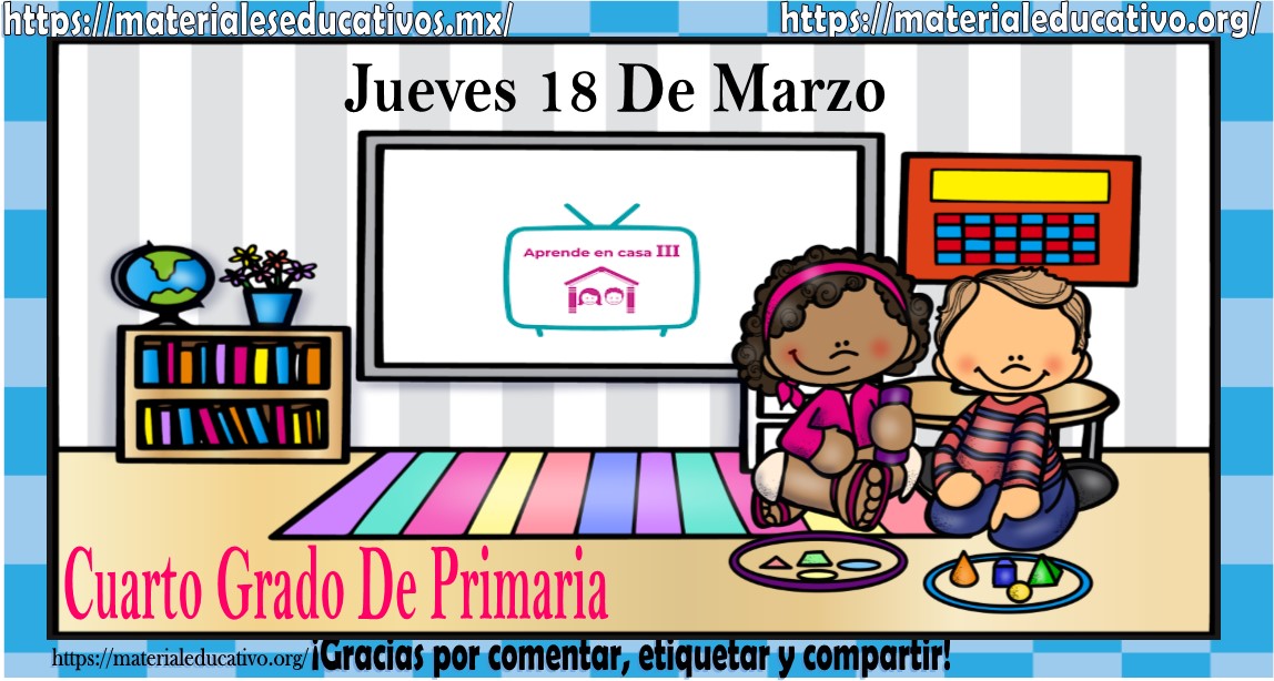 Amigos, compañeros docentes, padres de familia y alumnos que nos visitan, como ya es costumbre nosotros les proporcionaremos las clases contempladas para observarse en la TV del programa aprende en casa III, lo que antes se conocía como videos y preguntas. En esta oportunidad les queremos proporcionar las clases del cuarto grado de primaria del jueves 18 de marzo del 2021 del presente ciclo escolar 2020 – 2021, estaremos seguros que con este material podrá facilitar la realización de las actividades planteadas por parte del programa. Muchas gracias por visitarnos y recuerden que aquí podrán encontrar las preguntas, videos y todas las clases del programa de aprende en casa 2. Recuerden compartir nuestros enlaces en sus redes sociales y etiquetar a sus compañeros y amigos docentes en nuestras publicaciones.