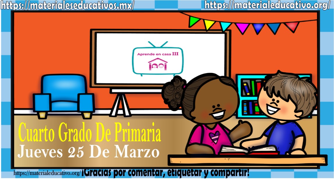 Amigos, compañeros docentes, padres de familia y alumnos que nos visitan, como ya es costumbre nosotros les proporcionaremos las clases contempladas para observarse en la TV del programa aprende en casa III, lo que antes se conocía como videos y preguntas. En esta oportunidad les queremos proporcionar las clases del cuarto grado de primaria del jueves 25 de marzo del 2021 del presente ciclo escolar 2020 – 2021, estaremos seguros que con este material podrá facilitar la realización de las actividades planteadas por parte del programa. Muchas gracias por visitarnos y recuerden que aquí podrán encontrar las preguntas, videos y todas las clases del programa de aprende en casa 2. Recuerden compartir nuestros enlaces en sus redes sociales y etiquetar a sus compañeros y amigos docentes en nuestras publicaciones.