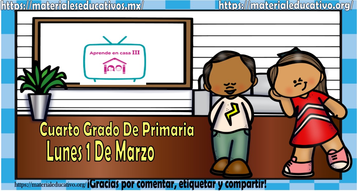 Amigos, compañeros docentes, padres de familia y alumnos que nos visitan, como ya es costumbre nosotros les proporcionaremos las clases contempladas para observarse en la TV del programa aprende en casa III, lo que antes se conocía como videos y preguntas. En esta oportunidad les queremos proporcionar las clases del cuarto grado de primaria del lunes 1 de marzo del 2021 del presente ciclo escolar 2020 – 2021, estaremos seguros que con este material podrá facilitar la realización de las actividades planteadas por parte del programa. Muchas gracias por visitarnos y recuerden que aquí podrán encontrar las preguntas, videos y todas las clases del programa de aprende en casa 2. Recuerden compartir nuestros enlaces en sus redes sociales y etiquetar a sus compañeros y amigos docentes en nuestras publicaciones.