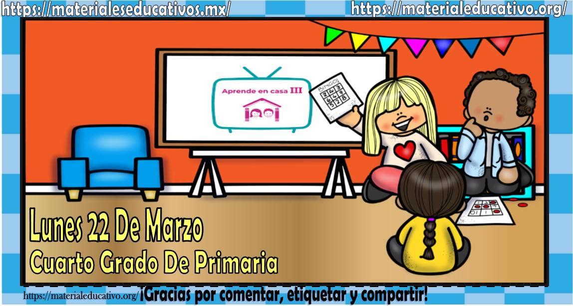 Amigos, compañeros docentes, padres de familia y alumnos que nos visitan, como ya es costumbre nosotros les proporcionaremos las clases contempladas para observarse en la TV del programa aprende en casa III, lo que antes se conocía como videos y preguntas. En esta oportunidad les queremos proporcionar las clases del cuarto grado de primaria del lunes 22 de marzo del 2021 del presente ciclo escolar 2020 – 2021, estaremos seguros que con este material podrá facilitar la realización de las actividades planteadas por parte del programa. Muchas gracias por visitarnos y recuerden que aquí podrán encontrar las preguntas, videos y todas las clases del programa de aprende en casa 2. Recuerden compartir nuestros enlaces en sus redes sociales y etiquetar a sus compañeros y amigos docentes en nuestras publicaciones.