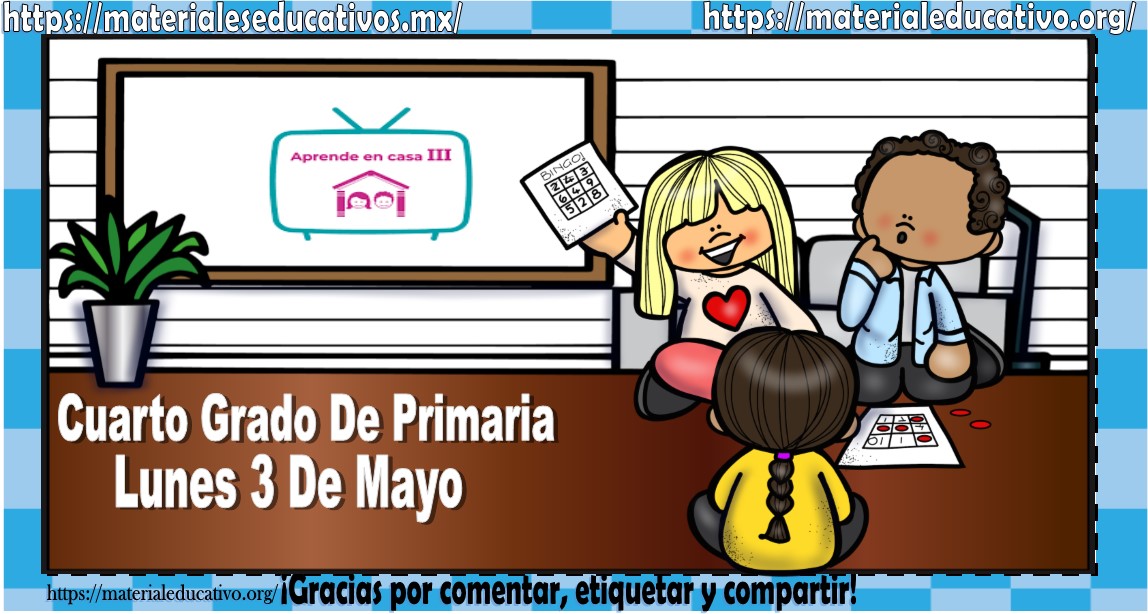 Amigos, compañeros docentes, padres de familia y alumnos que nos visitan, como ya es costumbre nosotros les proporcionaremos las clases contempladas para observarse en la TV del programa aprende en casa III, lo que antes se conocía como videos y preguntas. En esta oportunidad les queremos proporcionar las clases del cuarto grado de primaria del lunes 3 de mayo del 2021 del presente ciclo escolar 2020 – 2021, estaremos seguros que con este material podrá facilitar la realización de las actividades planteadas por parte del programa. Muchas gracias por visitarnos y recuerden que aquí podrán encontrar las preguntas, videos y todas las clases del programa de aprende en casa 2. Recuerden compartir nuestros enlaces en sus redes sociales y etiquetar a sus compañeros y amigos docentes en nuestras publicaciones.