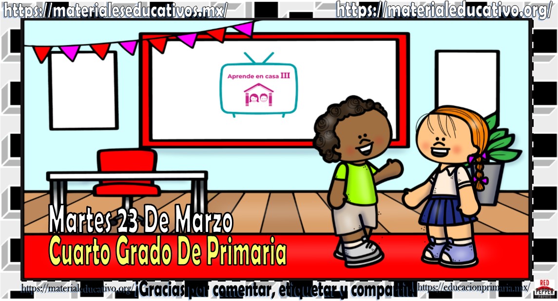 Amigos, compañeros docentes, padres de familia y alumnos que nos visitan, como ya es costumbre nosotros les proporcionaremos las clases contempladas para observarse en la TV del programa aprende en casa III, lo que antes se conocía como videos y preguntas. En esta oportunidad les queremos proporcionar las clases del cuarto grado de primaria del martes 23 de marzo del 2021 del presente ciclo escolar 2020 – 2021, estaremos seguros que con este material podrá facilitar la realización de las actividades planteadas por parte del programa. Muchas gracias por visitarnos y recuerden que aquí podrán encontrar las preguntas, videos y todas las clases del programa de aprende en casa 2. Recuerden compartir nuestros enlaces en sus redes sociales y etiquetar a sus compañeros y amigos docentes en nuestras publicaciones.