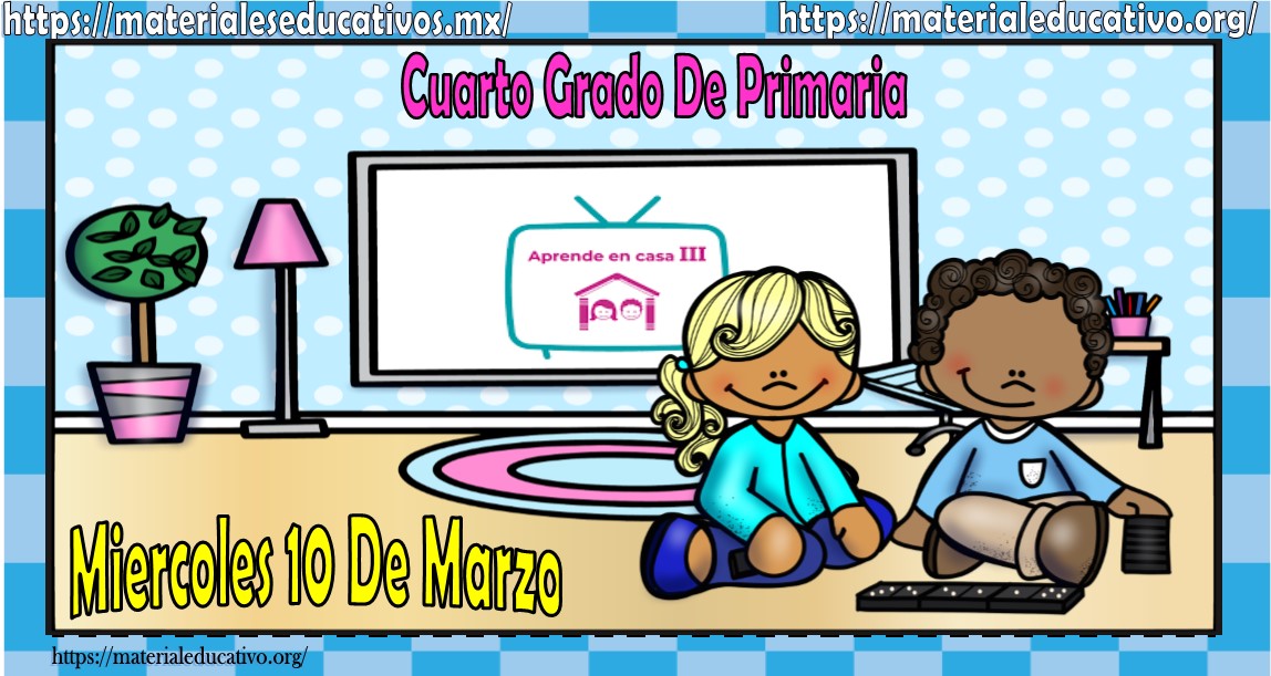 Amigos, compañeros docentes, padres de familia y alumnos que nos visitan, como ya es costumbre nosotros les proporcionaremos las clases contempladas para observarse en la TV del programa aprende en casa III, lo que antes se conocía como videos y preguntas. En esta oportunidad les queremos proporcionar las clases del cuarto grado de primaria del miércoles 10 de marzo del 2021 del presente ciclo escolar 2020 – 2021, estaremos seguros que con este material podrá facilitar la realización de las actividades planteadas por parte del programa. Muchas gracias por visitarnos y recuerden que aquí podrán encontrar las preguntas, videos y todas las clases del programa de aprende en casa 2. Recuerden compartir nuestros enlaces en sus redes sociales y etiquetar a sus compañeros y amigos docentes en nuestras publicaciones.