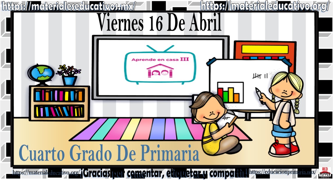 Amigos, compañeros docentes, padres de familia y alumnos que nos visitan, como ya es costumbre nosotros les proporcionaremos las clases contempladas para observarse en la TV del programa aprende en casa III, lo que antes se conocía como videos y preguntas. En esta oportunidad les queremos proporcionar las clases del cuarto grado de primaria del viernes 16 de abril del 2021 del presente ciclo escolar 2020 – 2021, estaremos seguros que con este material podrá facilitar la realización de las actividades planteadas por parte del programa. Muchas gracias por visitarnos y recuerden que aquí podrán encontrar las preguntas, videos y todas las clases del programa de aprende en casa 2. Recuerden compartir nuestros enlaces en sus redes sociales y etiquetar a sus compañeros y amigos docentes en nuestras publicaciones.