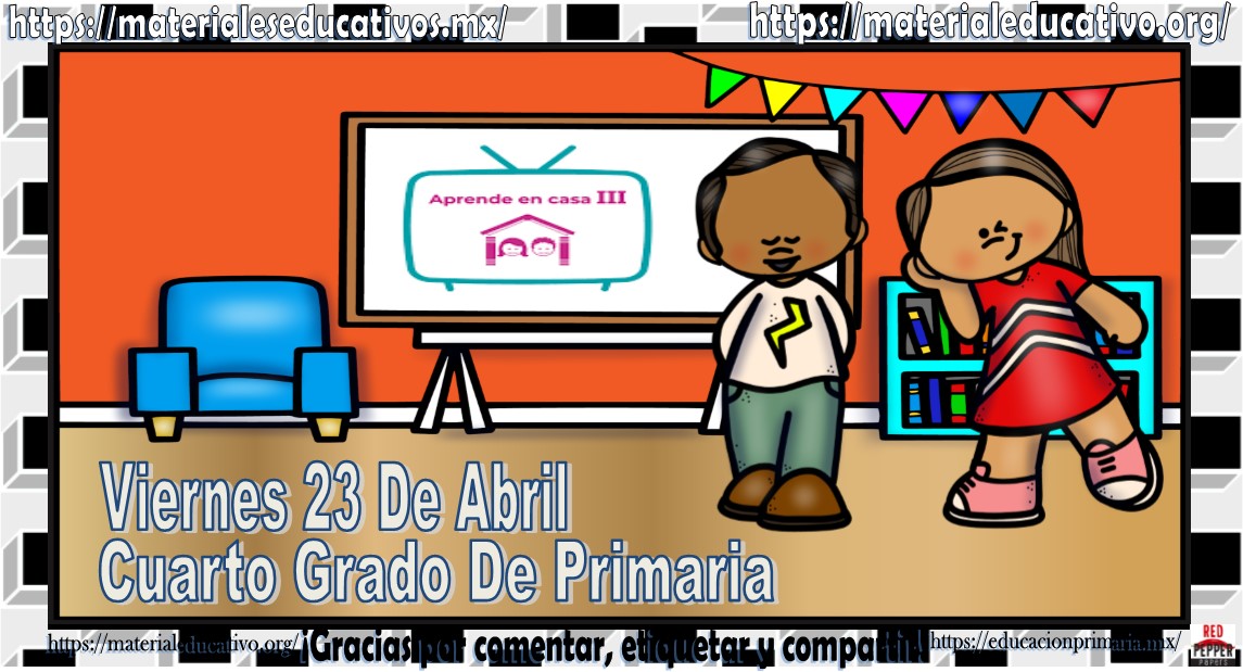 Amigos, compañeros docentes, padres de familia y alumnos que nos visitan, como ya es costumbre nosotros les proporcionaremos las clases contempladas para observarse en la TV del programa aprende en casa III, lo que antes se conocía como videos y preguntas. En esta oportunidad les queremos proporcionar las clases del cuarto grado de primaria del viernes 23 de abril del 2021 del presente ciclo escolar 2020 – 2021, estaremos seguros que con este material podrá facilitar la realización de las actividades planteadas por parte del programa. Muchas gracias por visitarnos y recuerden que aquí podrán encontrar las preguntas, videos y todas las clases del programa de aprende en casa 2. Recuerden compartir nuestros enlaces en sus redes sociales y etiquetar a sus compañeros y amigos docentes en nuestras publicaciones.