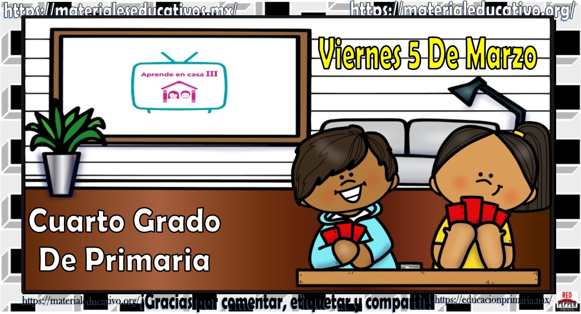 Amigos, compañeros docentes, padres de familia y alumnos que nos visitan, como ya es costumbre nosotros les proporcionaremos las clases contempladas para observarse en la TV del programa aprende en casa III, lo que antes se conocía como videos y preguntas. En esta oportunidad les queremos proporcionar las clases del cuarto grado de primaria del viernes 5 de marzo del 2021 del presente ciclo escolar 2020 – 2021, estaremos seguros que con este material podrá facilitar la realización de las actividades planteadas por parte del programa. Muchas gracias por visitarnos y recuerden que aquí podrán encontrar las preguntas, videos y todas las clases del programa de aprende en casa 2. Recuerden compartir nuestros enlaces en sus redes sociales y etiquetar a sus compañeros y amigos docentes en nuestras publicaciones.