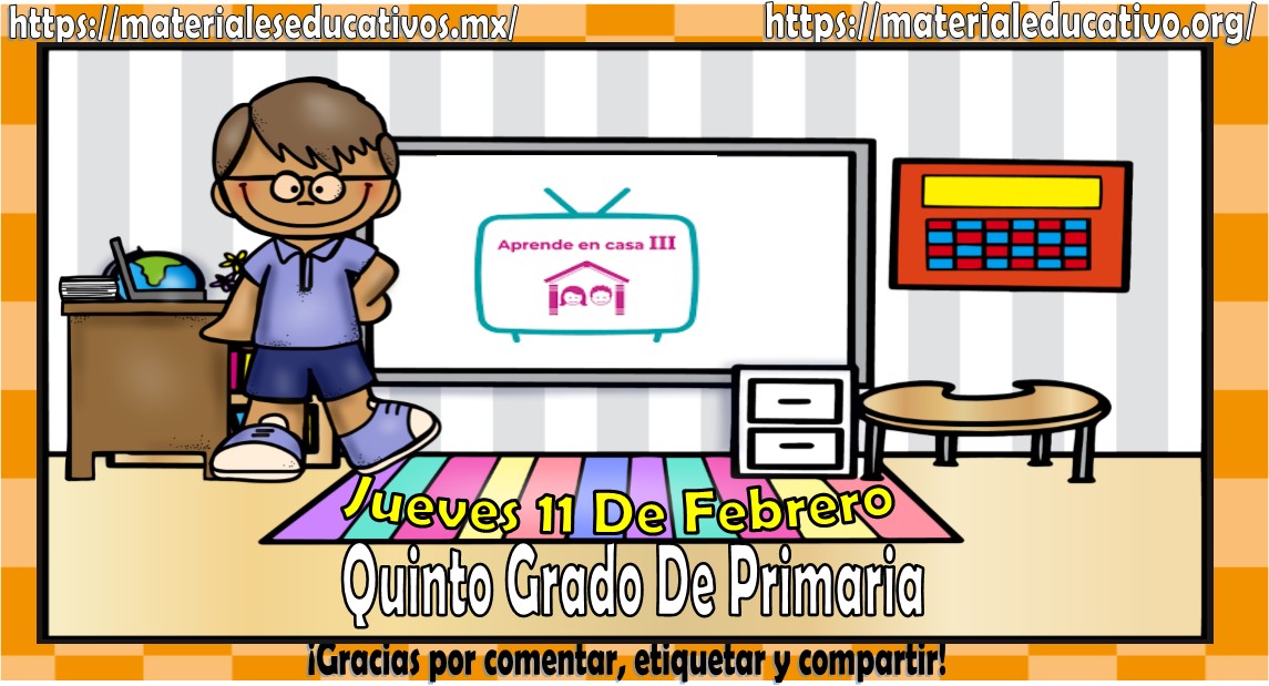 Amigos, compañeros docentes, padres de familia y alumnos que nos visitan, como ya es costumbre nosotros les proporcionaremos las clases contempladas para observarse en la TV del programa aprende en casa III, lo que antes se conocía como videos y preguntas. En esta oportunidad les queremos proporcionar las clases del quinto grado de primaria del jueves 11 de febrero del 2021 del presente ciclo escolar 2020 – 2021, estaremos seguros que con este material podrá facilitar la realización de las actividades planteadas por parte del programa. Muchas gracias por visitarnos y recuerden que aquí podrán encontrar las preguntas, videos y todas las clases del programa de aprende en casa 2. Recuerden compartir nuestros enlaces en sus redes sociales y etiquetar a sus compañeros y amigos docentes en nuestras publicaciones.