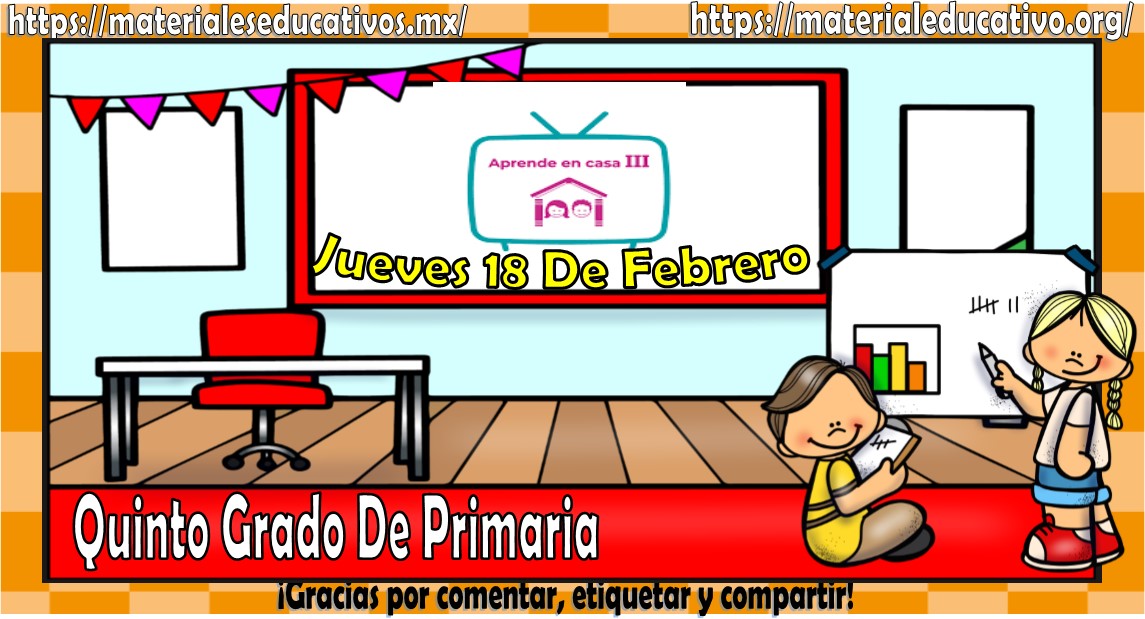 Amigos, compañeros docentes, padres de familia y alumnos que nos visitan, como ya es costumbre nosotros les proporcionaremos las clases contempladas para observarse en la TV del programa aprende en casa III, lo que antes se conocía como videos y preguntas. En esta oportunidad les queremos proporcionar las clases del quinto grado de primaria del jueves 18 de febrero del 2021 del presente ciclo escolar 2020 – 2021, estaremos seguros que con este material podrá facilitar la realización de las actividades planteadas por parte del programa. Muchas gracias por visitarnos y recuerden que aquí podrán encontrar las preguntas, videos y todas las clases del programa de aprende en casa 2. Recuerden compartir nuestros enlaces en sus redes sociales y etiquetar a sus compañeros y amigos docentes en nuestras publicaciones.