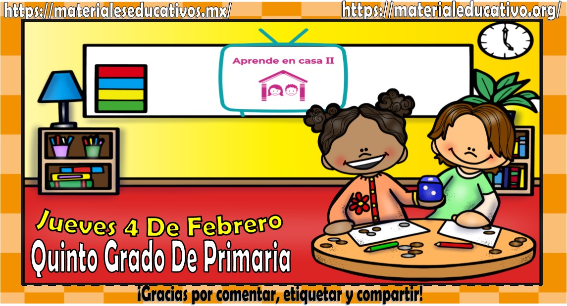 Amigos, compañeros docentes, padres de familia y alumnos que nos visitan, como ya es costumbre nosotros les proporcionaremos las clases contempladas para observarse en la TV del programa aprende en casa III, lo que antes se conocía como videos y preguntas. En esta oportunidad les queremos proporcionar las clases del quinto grado de primaria del jueves 4 de febrero del 2021 del presente ciclo escolar 2020 – 2021, estaremos seguros que con este material podrá facilitar la realización de las actividades planteadas por parte del programa. Muchas gracias por visitarnos y recuerden que aquí podrán encontrar las preguntas, videos y todas las clases del programa de aprende en casa 2. Recuerden compartir nuestros enlaces en sus redes sociales y etiquetar a sus compañeros y amigos docentes en nuestras publicaciones.