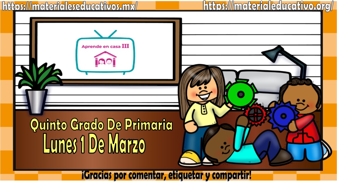 Amigos, compañeros docentes, padres de familia y alumnos que nos visitan, como ya es costumbre nosotros les proporcionaremos las clases contempladas para observarse en la TV del programa aprende en casa III, lo que antes se conocía como videos y preguntas. En esta oportunidad les queremos proporcionar las clases del quinto grado de primaria del lunes 1 de marzo del 2021 del presente ciclo escolar 2020 – 2021, estaremos seguros que con este material podrá facilitar la realización de las actividades planteadas por parte del programa. Muchas gracias por visitarnos y recuerden que aquí podrán encontrar las preguntas, videos y todas las clases del programa de aprende en casa 2. Recuerden compartir nuestros enlaces en sus redes sociales y etiquetar a sus compañeros y amigos docentes en nuestras publicaciones.