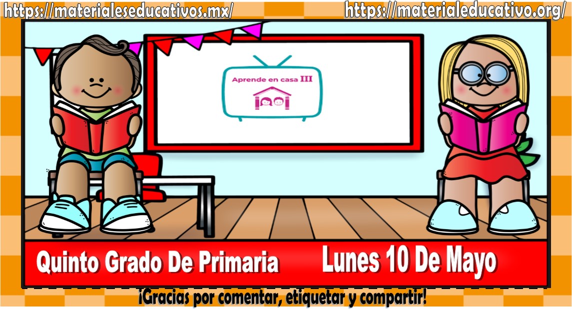 Amigos, compañeros docentes, padres de familia y alumnos que nos visitan, como ya es costumbre nosotros les proporcionaremos las clases contempladas para observarse en la TV del programa aprende en casa III, lo que antes se conocía como videos y preguntas. En esta oportunidad les queremos proporcionar las clases del quinto grado de primaria del lunes 10 de mayo del 2021 del presente ciclo escolar 2020 – 2021, estaremos seguros que con este material podrá facilitar la realización de las actividades planteadas por parte del programa. Muchas gracias por visitarnos y recuerden que aquí podrán encontrar las preguntas, videos y todas las clases del programa de aprende en casa 2. Recuerden compartir nuestros enlaces en sus redes sociales y etiquetar a sus compañeros y amigos docentes en nuestras publicaciones.