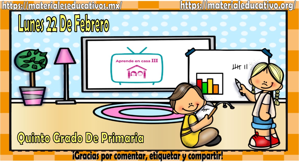 Amigos, compañeros docentes, padres de familia y alumnos que nos visitan, como ya es costumbre nosotros les proporcionaremos las clases contempladas para observarse en la TV del programa aprende en casa III, lo que antes se conocía como videos y preguntas. En esta oportunidad les queremos proporcionar las clases del quinto grado de primaria del lunes 22 de febrero del 2021 del presente ciclo escolar 2020 – 2021, estaremos seguros que con este material podrá facilitar la realización de las actividades planteadas por parte del programa. Muchas gracias por visitarnos y recuerden que aquí podrán encontrar las preguntas, videos y todas las clases del programa de aprende en casa 2. Recuerden compartir nuestros enlaces en sus redes sociales y etiquetar a sus compañeros y amigos docentes en nuestras publicaciones.