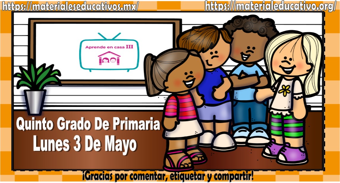 Amigos, compañeros docentes, padres de familia y alumnos que nos visitan, como ya es costumbre nosotros les proporcionaremos las clases contempladas para observarse en la TV del programa aprende en casa III, lo que antes se conocía como videos y preguntas. En esta oportunidad les queremos proporcionar las clases del quinto grado de primaria del lunes 3 de mayo del 2021 del presente ciclo escolar 2020 – 2021, estaremos seguros que con este material podrá facilitar la realización de las actividades planteadas por parte del programa. Muchas gracias por visitarnos y recuerden que aquí podrán encontrar las preguntas, videos y todas las clases del programa de aprende en casa 2. Recuerden compartir nuestros enlaces en sus redes sociales y etiquetar a sus compañeros y amigos docentes en nuestras publicaciones.