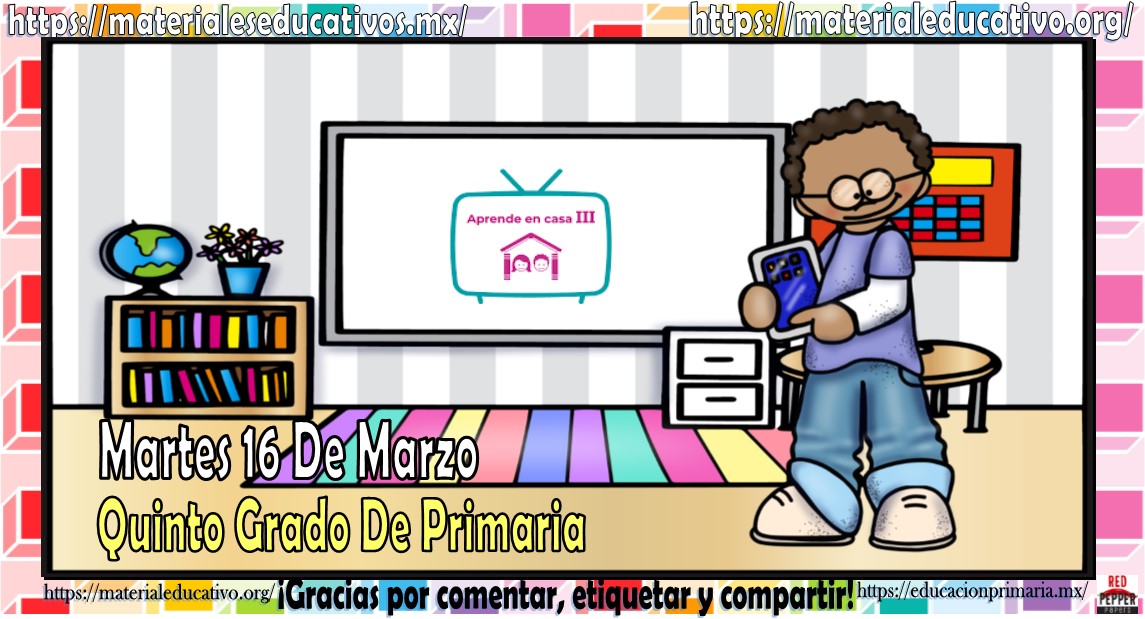 Amigos, compañeros docentes, padres de familia y alumnos que nos visitan, como ya es costumbre nosotros les proporcionaremos las clases contempladas para observarse en la TV del programa aprende en casa III, lo que antes se conocía como videos y preguntas. En esta oportunidad les queremos proporcionar las clases del quinto grado de primaria del martes 16 de marzo del 2021 del presente ciclo escolar 2020 – 2021, estaremos seguros que con este material podrá facilitar la realización de las actividades planteadas por parte del programa. Muchas gracias por visitarnos y recuerden que aquí podrán encontrar las preguntas, videos y todas las clases del programa de aprende en casa 2. Recuerden compartir nuestros enlaces en sus redes sociales y etiquetar a sus compañeros y amigos docentes en nuestras publicaciones.