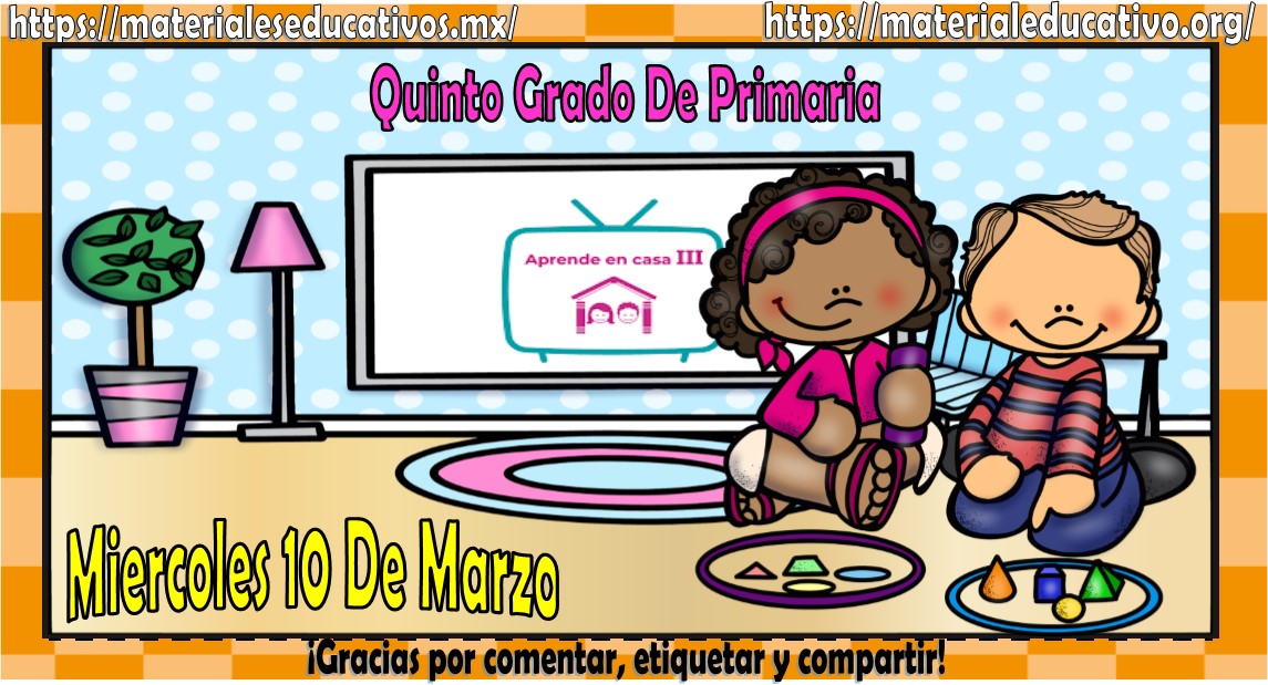 Amigos, compañeros docentes, padres de familia y alumnos que nos visitan, como ya es costumbre nosotros les proporcionaremos las clases contempladas para observarse en la TV del programa aprende en casa III, lo que antes se conocía como videos y preguntas. En esta oportunidad les queremos proporcionar las clases del quinto grado de primaria del miércoles 10 de marzo del 2021 del presente ciclo escolar 2020 – 2021, estaremos seguros que con este material podrá facilitar la realización de las actividades planteadas por parte del programa. Muchas gracias por visitarnos y recuerden que aquí podrán encontrar las preguntas, videos y todas las clases del programa de aprende en casa 2. Recuerden compartir nuestros enlaces en sus redes sociales y etiquetar a sus compañeros y amigos docentes en nuestras publicaciones.