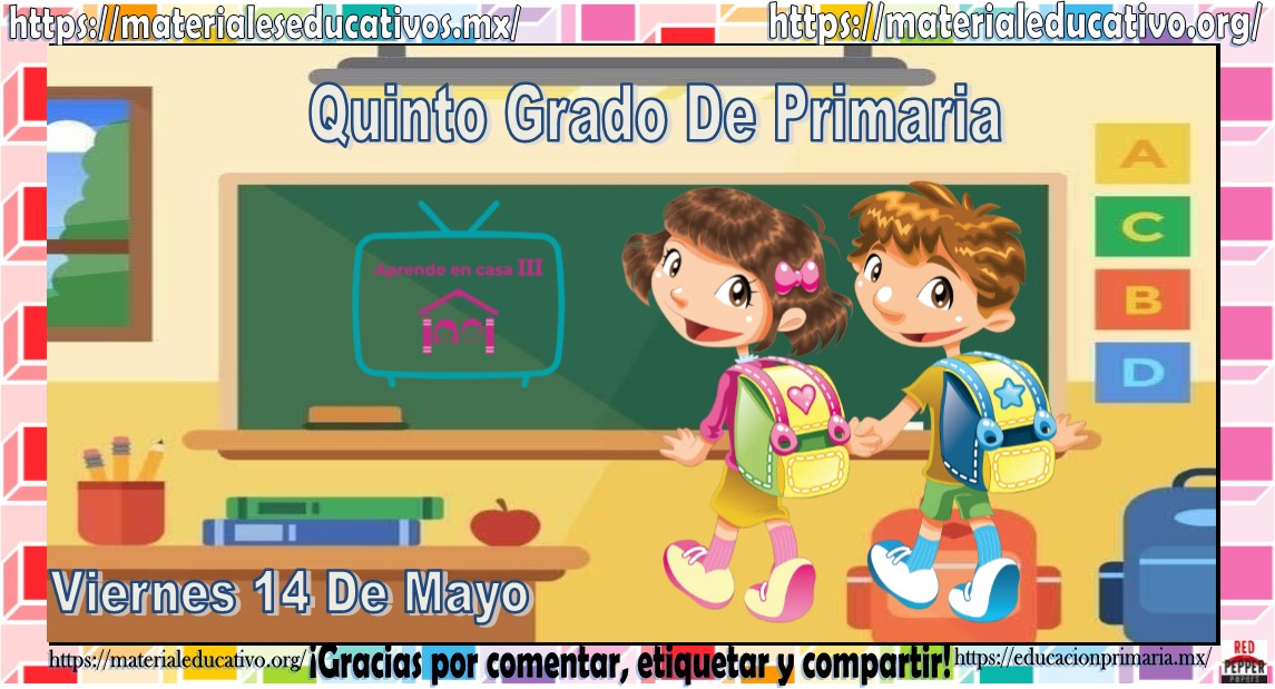 Amigos, compañeros docentes, padres de familia y alumnos que nos visitan, como ya es costumbre nosotros les proporcionaremos las clases contempladas para observarse en la TV del programa aprende en casa III, lo que antes se conocía como videos y preguntas. En esta oportunidad les queremos proporcionar las clases del quinto grado de primaria del viernes 14 de mayo del 2021 del presente ciclo escolar 2020 – 2021, estaremos seguros que con este material podrá facilitar la realización de las actividades planteadas por parte del programa. Muchas gracias por visitarnos y recuerden que aquí podrán encontrar las preguntas, videos y todas las clases del programa de aprende en casa 2. Recuerden compartir nuestros enlaces en sus redes sociales y etiquetar a sus compañeros y amigos docentes en nuestras publicaciones.