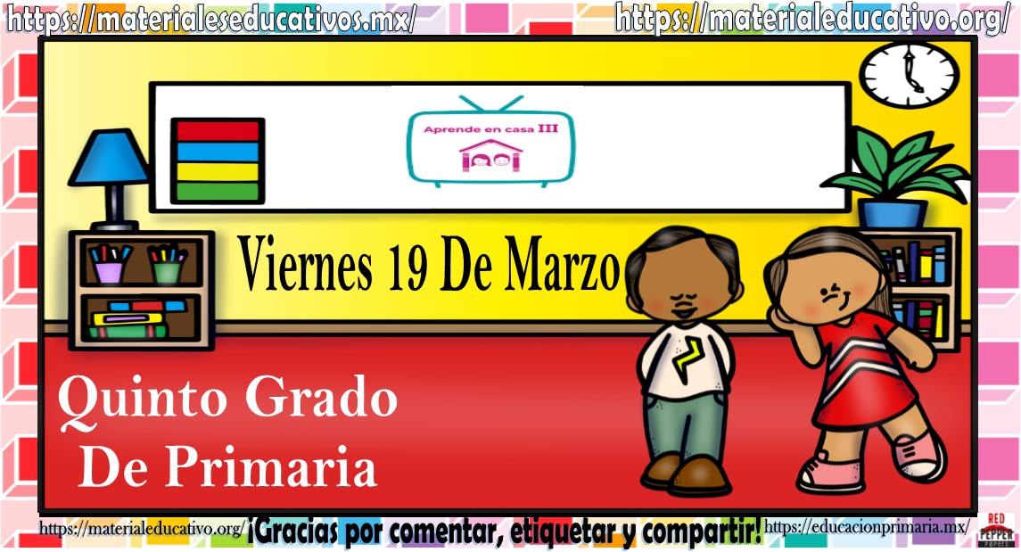 Amigos, compañeros docentes, padres de familia y alumnos que nos visitan, como ya es costumbre nosotros les proporcionaremos las clases contempladas para observarse en la TV del programa aprende en casa III, lo que antes se conocía como videos y preguntas. En esta oportunidad les queremos proporcionar las clases del quinto grado de primaria del viernes 19 de marzo del 2021 del presente ciclo escolar 2020 – 2021, estaremos seguros que con este material podrá facilitar la realización de las actividades planteadas por parte del programa. Muchas gracias por visitarnos y recuerden que aquí podrán encontrar las preguntas, videos y todas las clases del programa de aprende en casa 2. Recuerden compartir nuestros enlaces en sus redes sociales y etiquetar a sus compañeros y amigos docentes en nuestras publicaciones.