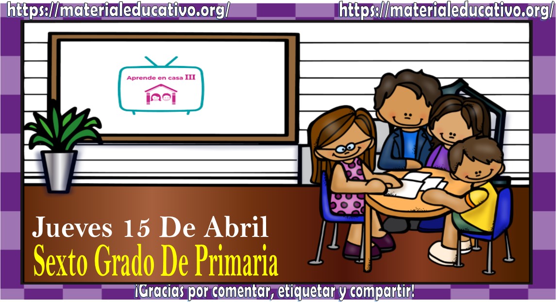 Amigos, compañeros docentes, padres de familia y alumnos que nos visitan, como ya es costumbre nosotros les proporcionaremos las clases contempladas para observarse en la TV del programa aprende en casa III, lo que antes se conocía como videos y preguntas. En esta oportunidad les queremos proporcionar las clases del sexto grado de primaria del jueves 15 de abril del 2021 del presente ciclo escolar 2020 – 2021, estaremos seguros que con este material podrá facilitar la realización de las actividades planteadas por parte del programa. Muchas gracias por visitarnos y recuerden que aquí podrán encontrar las preguntas, videos y todas las clases del programa de aprende en casa 2. Recuerden compartir nuestros enlaces en sus redes sociales y etiquetar a sus compañeros y amigos docentes en nuestras publicaciones.