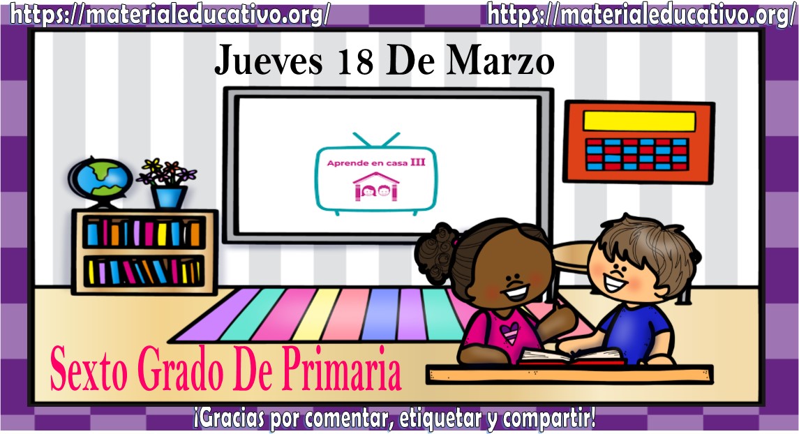 Amigos, compañeros docentes, padres de familia y alumnos que nos visitan, como ya es costumbre nosotros les proporcionaremos las clases contempladas para observarse en la TV del programa aprende en casa III, lo que antes se conocía como videos y preguntas. En esta oportunidad les queremos proporcionar las clases del sexto grado de primaria del jueves 18 de marzo del 2021 del presente ciclo escolar 2020 – 2021, estaremos seguros que con este material podrá facilitar la realización de las actividades planteadas por parte del programa. Muchas gracias por visitarnos y recuerden que aquí podrán encontrar las preguntas, videos y todas las clases del programa de aprende en casa 2. Recuerden compartir nuestros enlaces en sus redes sociales y etiquetar a sus compañeros y amigos docentes en nuestras publicaciones.
