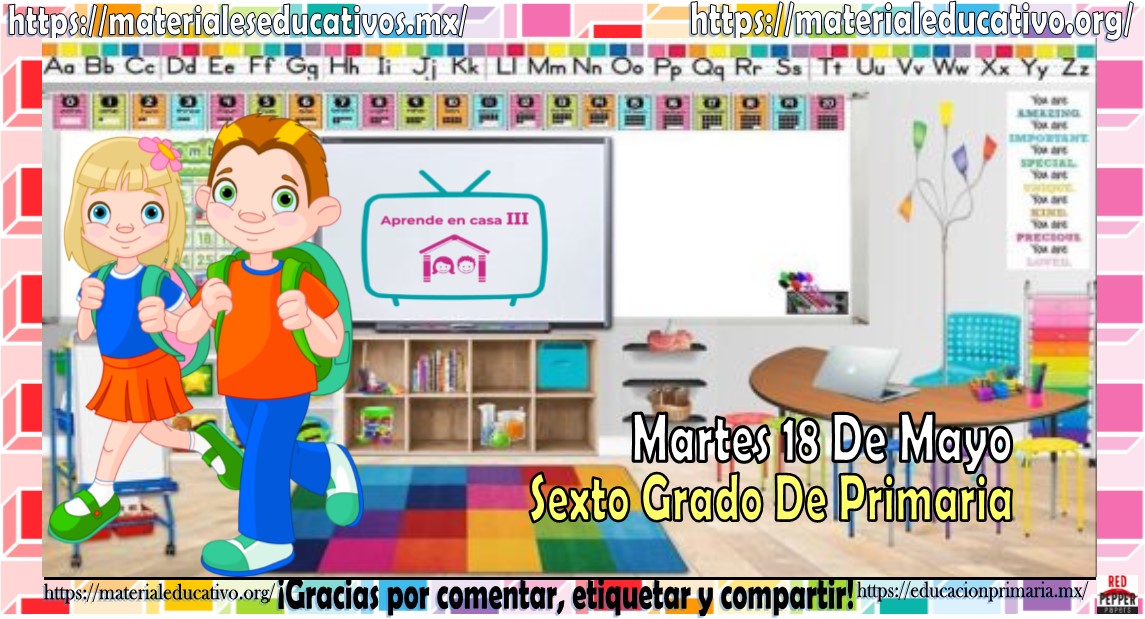 Amigos, compañeros docentes, padres de familia y alumnos que nos visitan, como ya es costumbre nosotros les proporcionaremos las clases contempladas para observarse en la TV del programa aprende en casa III, lo que antes se conocía como videos y preguntas. En esta oportunidad les queremos proporcionar las clases del sexto grado de primaria del martes 18 de mayo del 2021 del presente ciclo escolar 2020 – 2021, estaremos seguros que con este material podrá facilitar la realización de las actividades planteadas por parte del programa. Muchas gracias por visitarnos y recuerden que aquí podrán encontrar las preguntas, videos y todas las clases del programa de aprende en casa 2. Recuerden compartir nuestros enlaces en sus redes sociales y etiquetar a sus compañeros y amigos docentes en nuestras publicaciones.