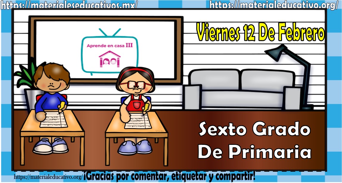 Amigos, compañeros docentes, padres de familia y alumnos que nos visitan, como ya es costumbre nosotros les proporcionaremos las clases contempladas para observarse en la TV del programa aprende en casa III, lo que antes se conocía como videos y preguntas. En esta oportunidad les queremos proporcionar las clases del sexto grado de primaria del viernes 12 de febrero del 2021 del presente ciclo escolar 2020 – 2021, estaremos seguros que con este material podrá facilitar la realización de las actividades planteadas por parte del programa. Muchas gracias por visitarnos y recuerden que aquí podrán encontrar las preguntas, videos y todas las clases del programa de aprende en casa 2. Recuerden compartir nuestros enlaces en sus redes sociales y etiquetar a sus compañeros y amigos docentes en nuestras publicaciones.