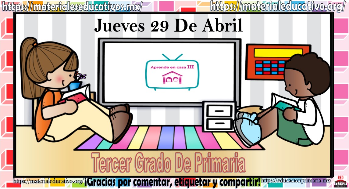 Amigos, compañeros docentes, padres de familia y alumnos que nos visitan, como ya es costumbre nosotros les proporcionaremos las clases contempladas para observarse en la TV del programa aprende en casa III, lo que antes se conocía como videos y preguntas. En esta oportunidad les queremos proporcionar las clases del tercer grado de primaria del jueves 29 de abril del 2021 del presente ciclo escolar 2020 – 2021, estaremos seguros que con este material podrá facilitar la realización de las actividades planteadas por parte del programa. Muchas gracias por visitarnos y recuerden que aquí podrán encontrar las preguntas, videos y todas las clases del programa de aprende en casa 2. Recuerden compartir nuestros enlaces en sus redes sociales y etiquetar a sus compañeros y amigos docentes en nuestras publicaciones.