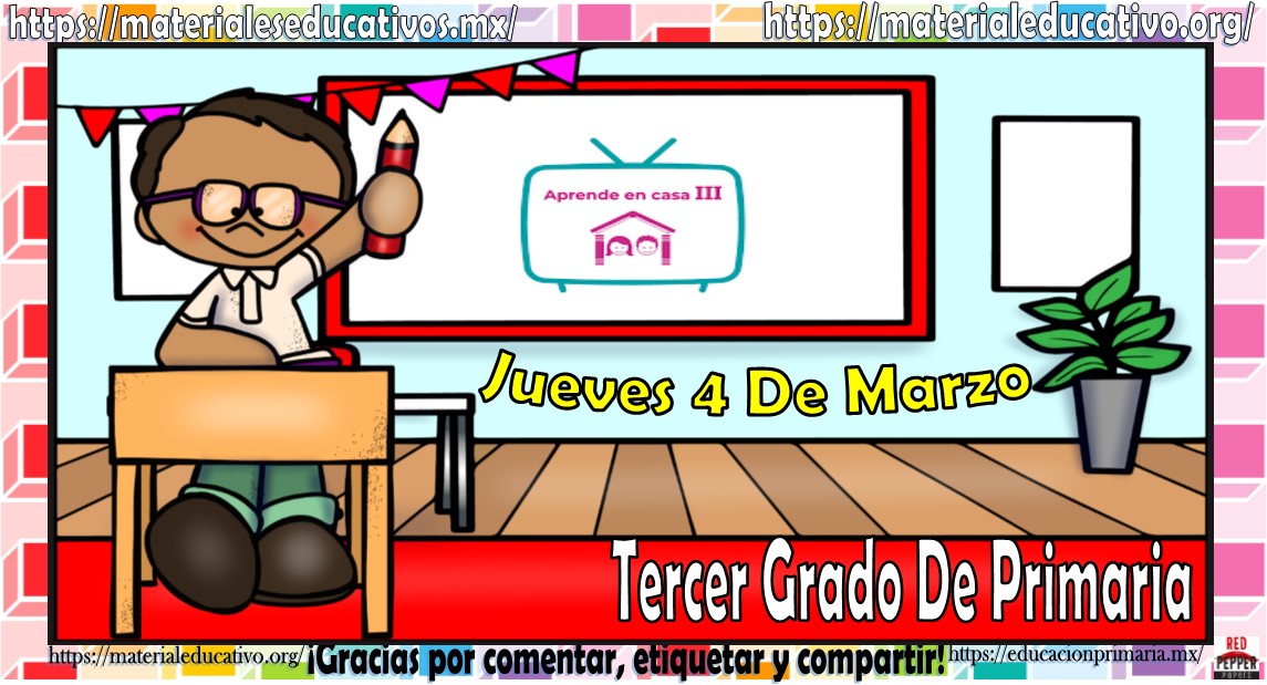 Amigos, compañeros docentes, padres de familia y alumnos que nos visitan, como ya es costumbre nosotros les proporcionaremos las clases contempladas para observarse en la TV del programa aprende en casa III, lo que antes se conocía como videos y preguntas. En esta oportunidad les queremos proporcionar las clases del tercer grado de primaria del jueves 4 de marzo del 2021 del presente ciclo escolar 2020 – 2021, estaremos seguros que con este material podrá facilitar la realización de las actividades planteadas por parte del programa. Muchas gracias por visitarnos y recuerden que aquí podrán encontrar las preguntas, videos y todas las clases del programa de aprende en casa 2. Recuerden compartir nuestros enlaces en sus redes sociales y etiquetar a sus compañeros y amigos docentes en nuestras publicaciones.
